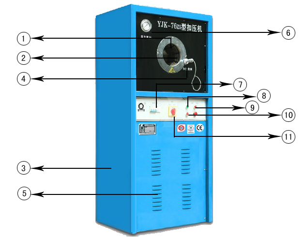 1、機 頭2、模 具3、機 體4、微調機構 5、散熱孔6、壓力表7、電源開關8、扣壓按扭9、點動、自動旋扭10、開模按扭11、油泵電機起動停止按扭